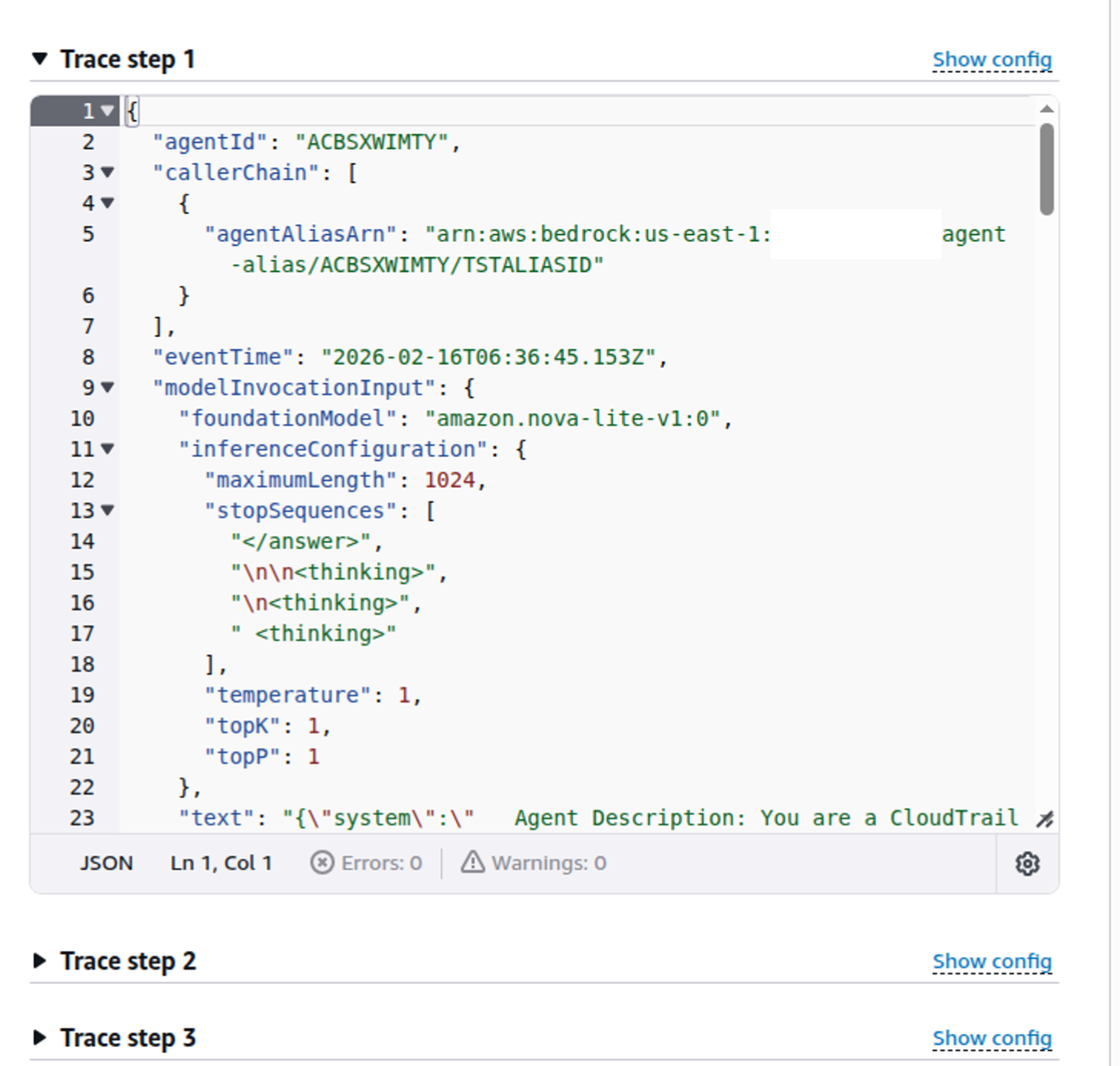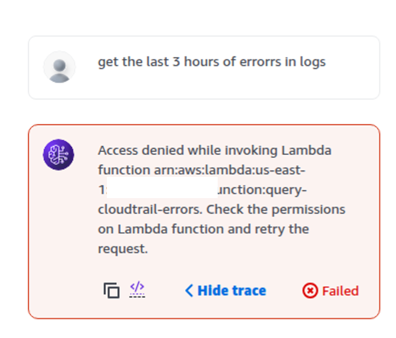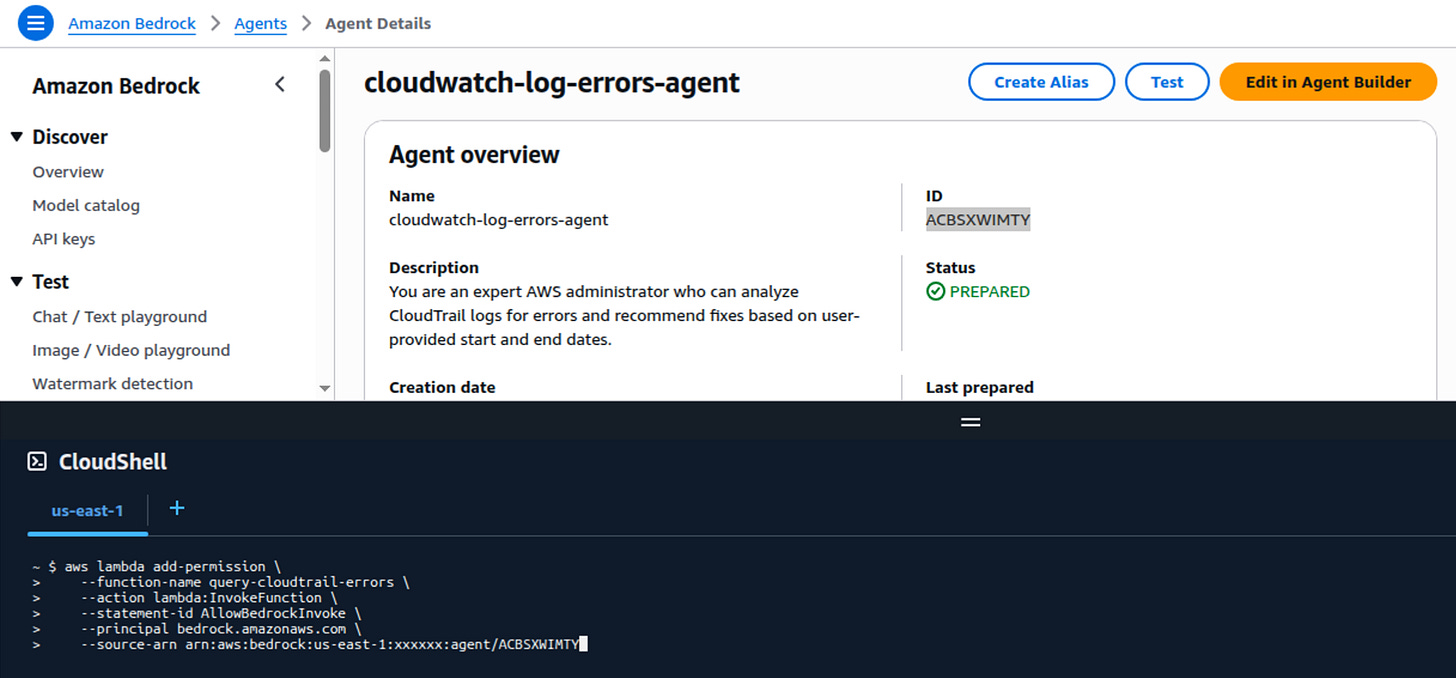 cloudtrail:LookupEventsand the ability to invoke the Bedrock model for error analysis.[See code it gave me in my Lambda post]