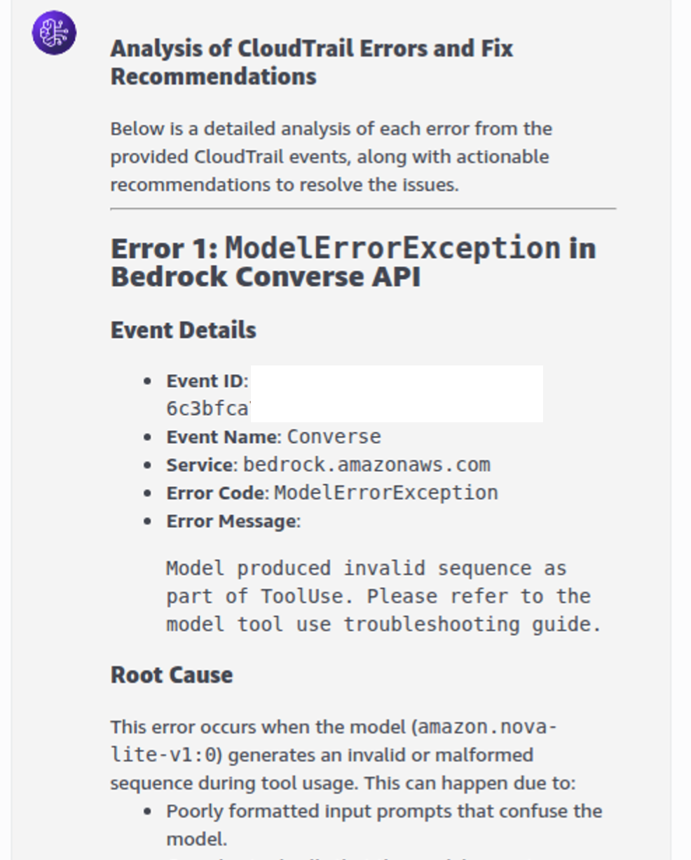 startDateandendDateparameters from your prompt or by asking follow-up questions.Example Prompt: “Analyze CloudTrail logs for errors from 2025-01-01 to 2025-01-05 and tell me how to fix them.”
