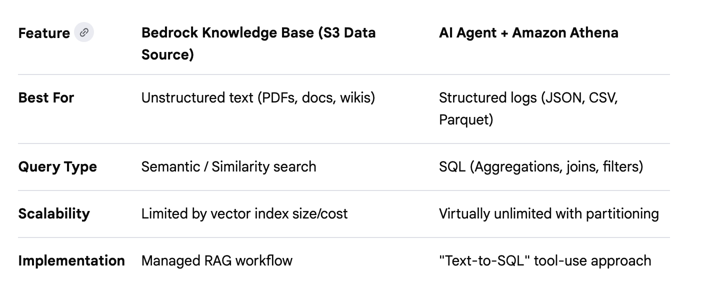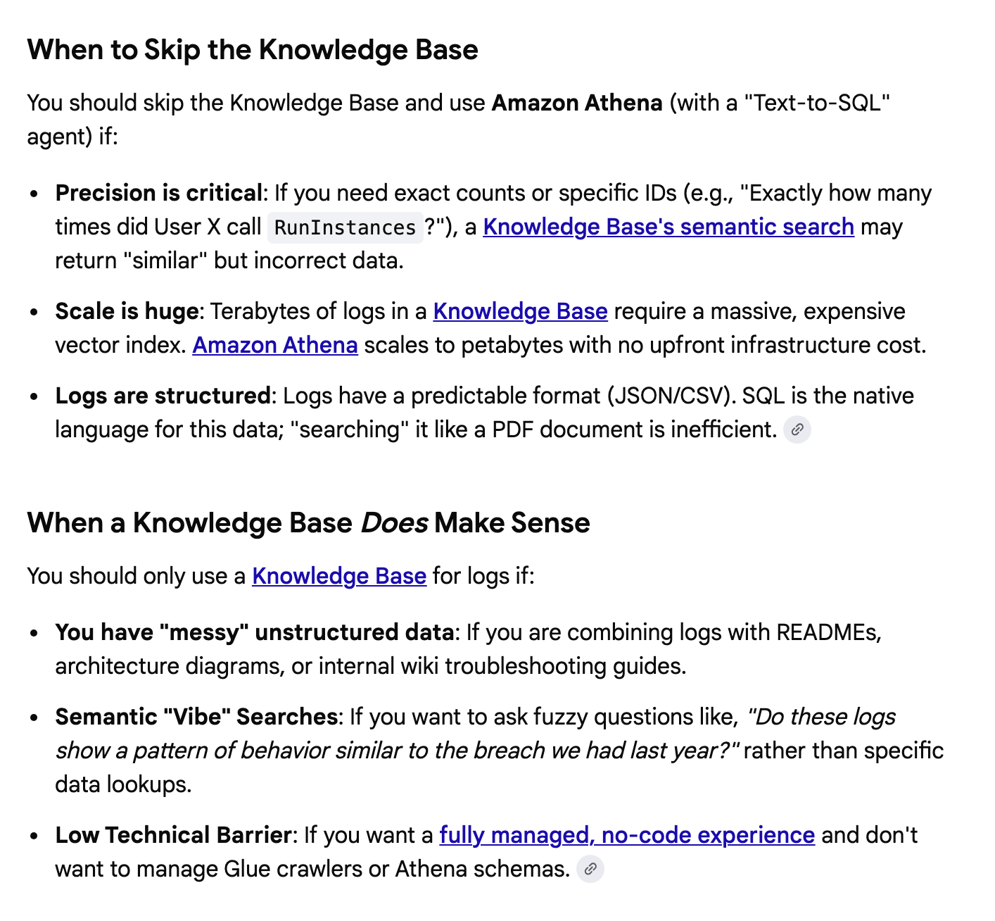 I thought about using the CloudTrail logs as a Knowledge Base. Does that even make any sense? I would need to query the logs and store them in such a manner that they could be used in the knowledge base. They don’t seem like the right kind of data to be in a knowledge base. And if you are going to go through all that trouble maybe you should be using CloudTrail Lake instead.
