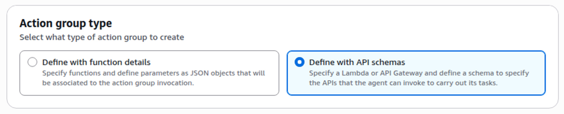 For the Action group type I chose Define with API Schemas as recommended.