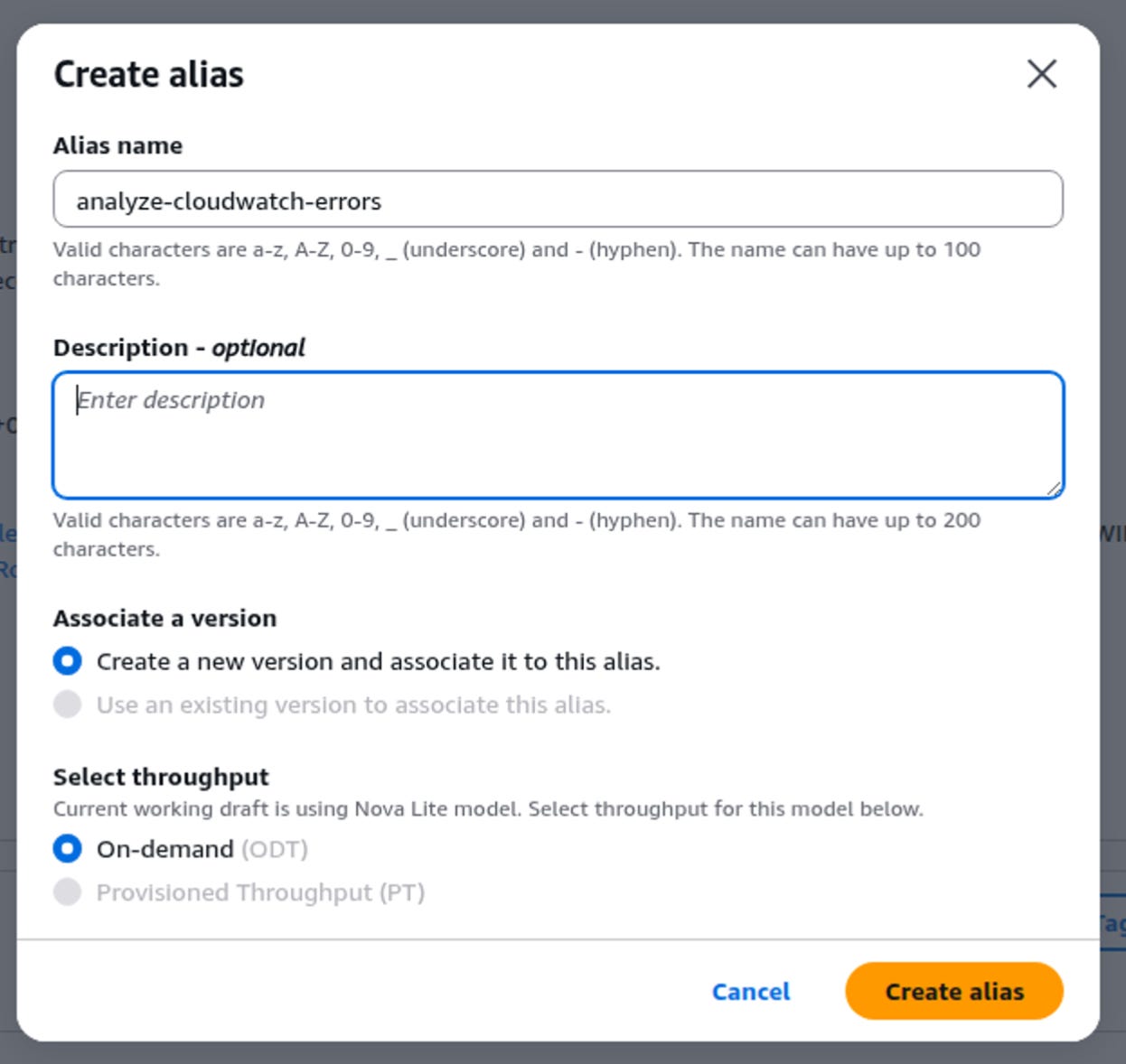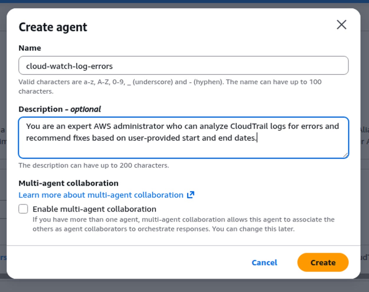 Provide a descriptive name and instructions (e.g., “You are an expert AWS administrator who can analyze CloudTrail logs for errors and recommend fixes based on user-provided start and end dates.”).