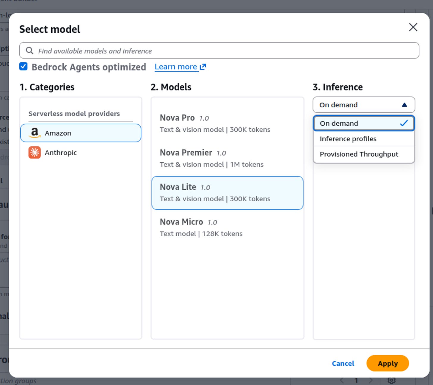 I selected an Amazon Nova model. Not sure about all these options yet so I leave the defaults.