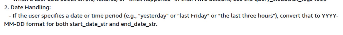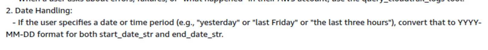"You have access to a session attribute called current_time. Whenever a user asks for a relative date (e.g., 'today', 'yesterday', 'the last 24 hours'), use current_time to calculate the exact YYYY-MM-DD or ISO strings. Send these as start_date_str and end_date_str to the query_cloudtrail_logs tool."Maybe that would help.