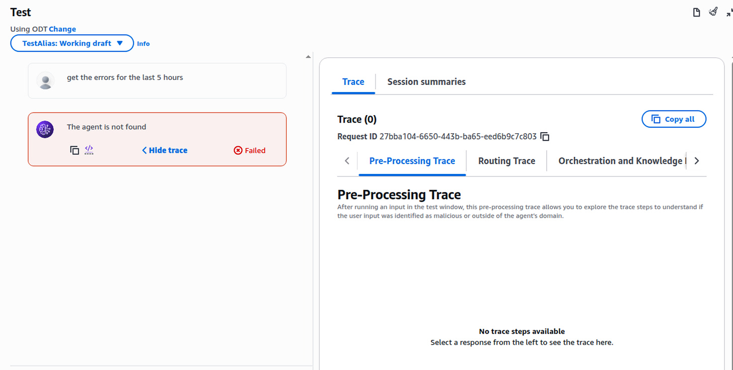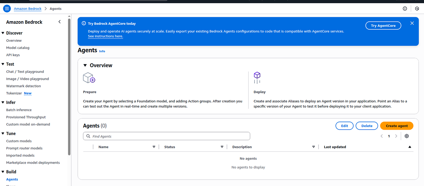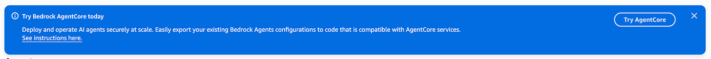 I found the UI a bit cumbersome to use. I also dee this note at the top that seems to be pushing AgentCore. I wonder if this section in Bedrock Agents will be going away as AWS pushes people towards AgentCore.