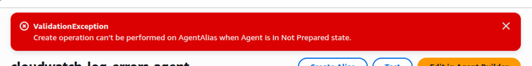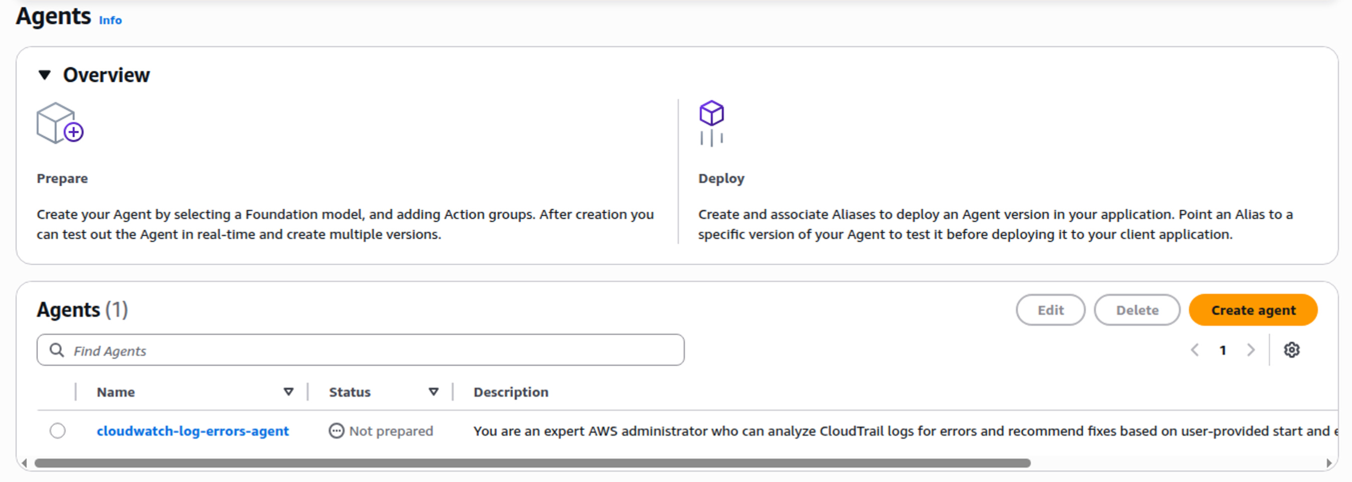 I had noticed something earlier on the main agent list that said something about Not prepared so I went back to that screen. Yes there it is. I presume that means the agent is somehow not read to run. When I look at the top boxes above that it says Prepare..Deploy. In the deploy box it says to create an alias. Where was that?