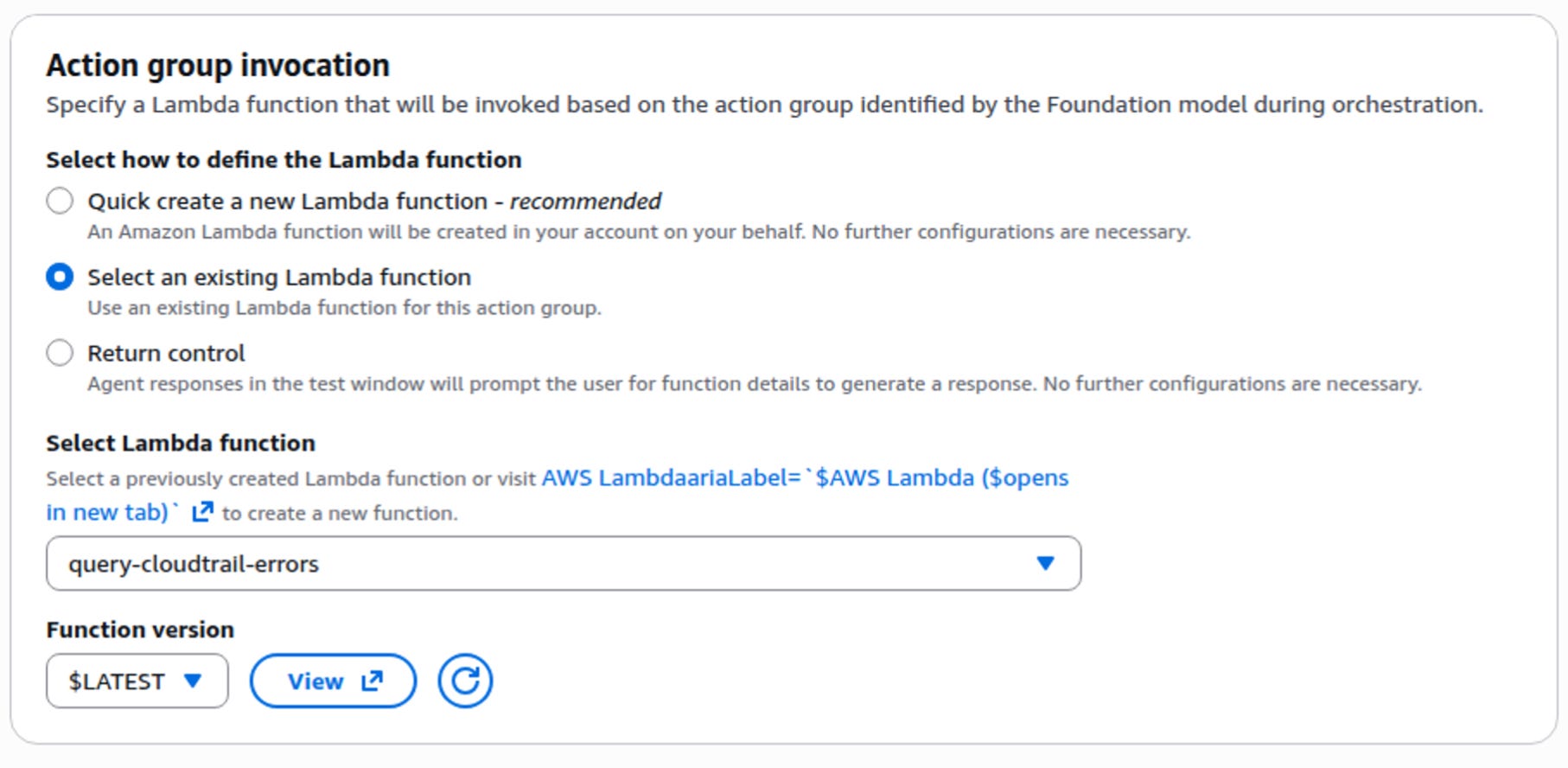 Ensure the Bedrock agent’s IAM role has a trust policy allowing it to invoke the Lambda function, and the Lambda function’s execution role has permissions to access CloudTrail and Amazon Bedrock.