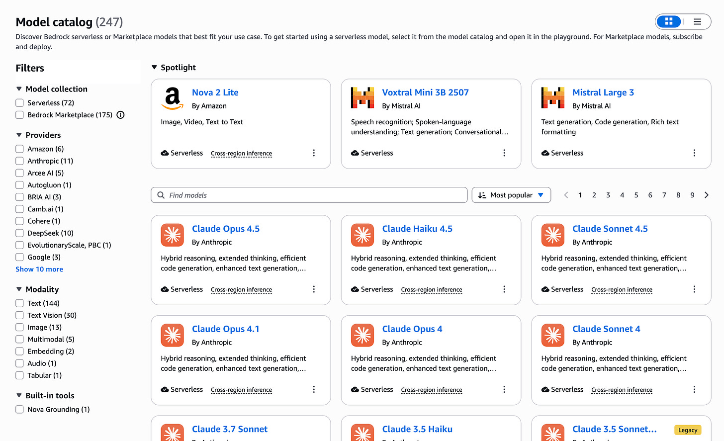 One of the key differentiators of Amazon’s approach to AI is that they let you use any model you want. They offer over 247 models in their catalog as of today when more added all the time. The other key differentiator is how they approach AI security. From the beginning they have chosen to make a copy of the model so what you submit to the model in prompts doesn’t end up in the model ro being trained by it - if using Amazon Bedrock. Read the fine print for some of the other services.