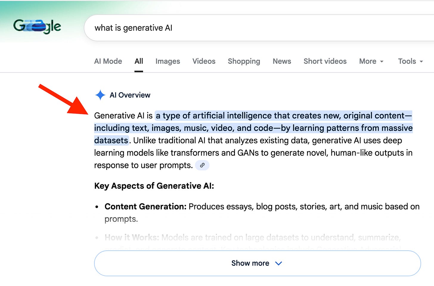 Generative AI is a particular form of AI where you give a model a prompt and it generates text, images, audio, or video based on the information you give it. You’re already using generative AI if you use google search. You enter a question and it generates a human readable answer instead of a list of links. The text is essentially a prediction of what it thinks the answer to your question is based on being trained on lots and lots of data across the internet.