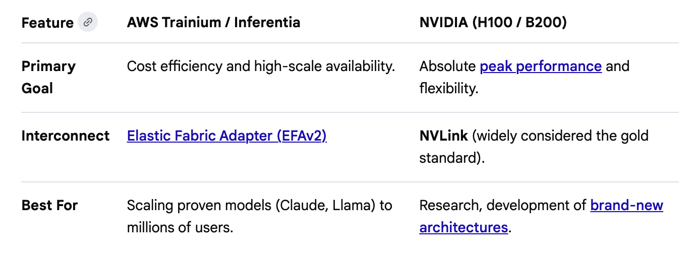 If you are training the next world-record model and money is no object, you use NVIDIA H100s or B200s. If you are scaling an application to millions of users and want to cut your monthly cloud bill in half, you move to AWS Inferentia or Trainium.