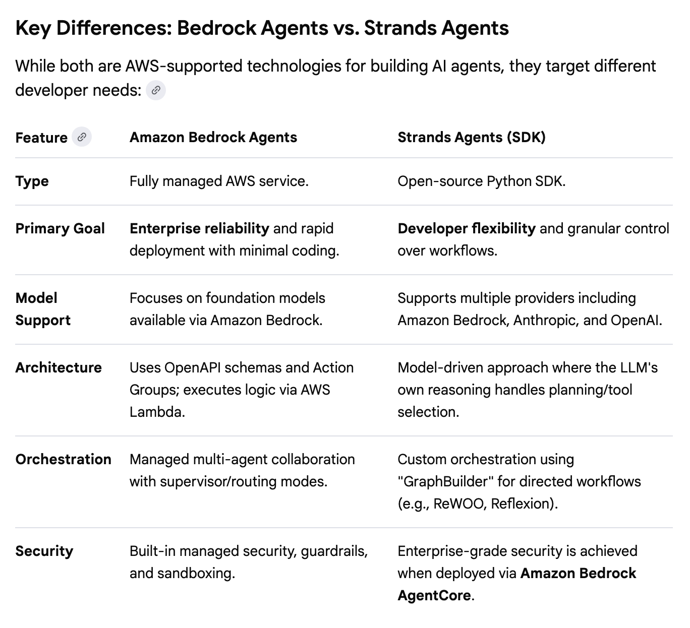 Here’s what Google says are the key differences between Bedrock Agents and Strands Agents: