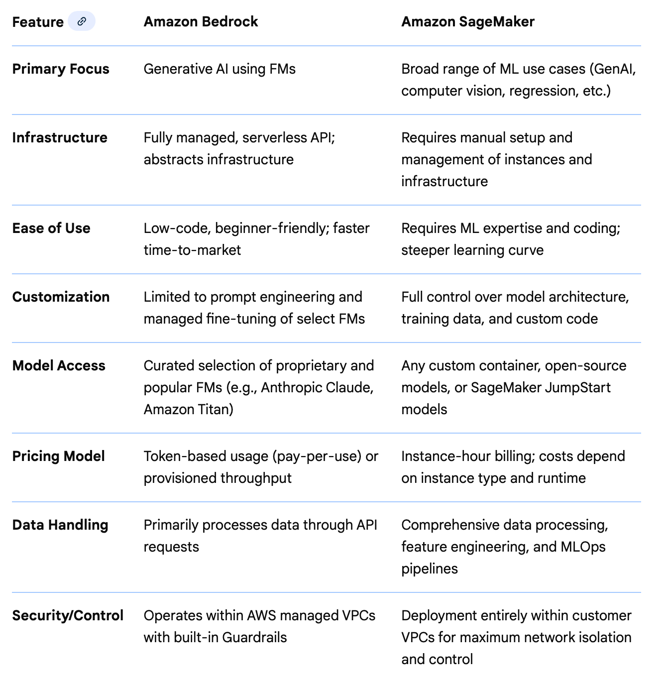 Amazon Bedrock aims to provide a simpler tool to use that handles some of the things you might do in Amazon SageMaker for you. It was created to make AI and machine learning easier to use. It also focuses more on Generative AI - the branch of AI that creates text, images, audio and video based on prompts (the text you give the model to produce your desired output). Here’s how Google summarizes the difference between the two using their generative AI chatbot: