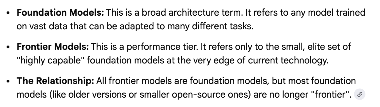 Essentially it’s saying that frontier models are more cutting-edge. All Frontier Models are Foundation Models, but not every foundation model is considered "frontier.”
