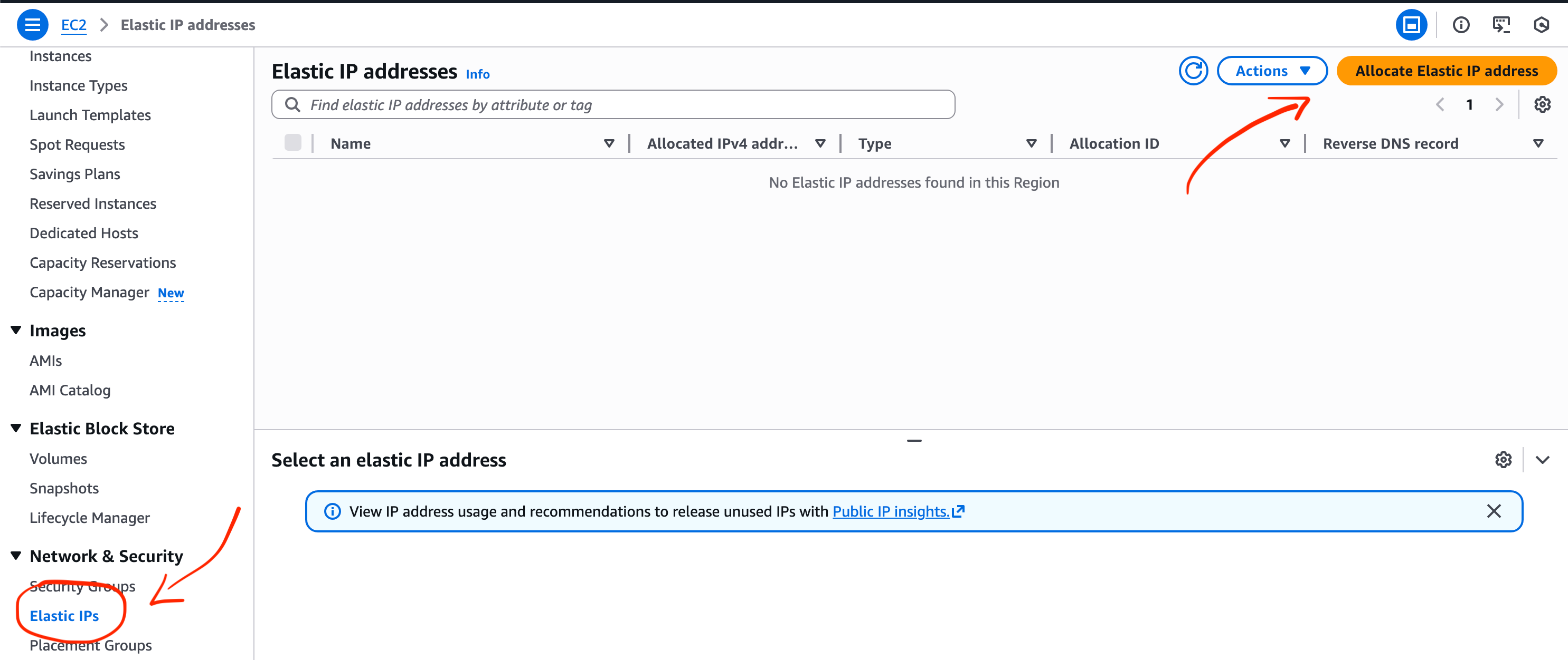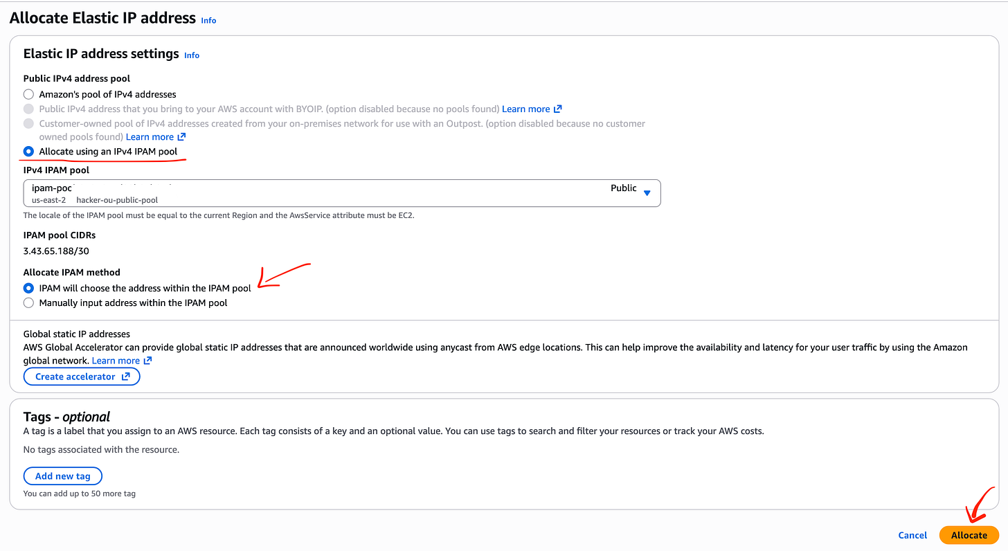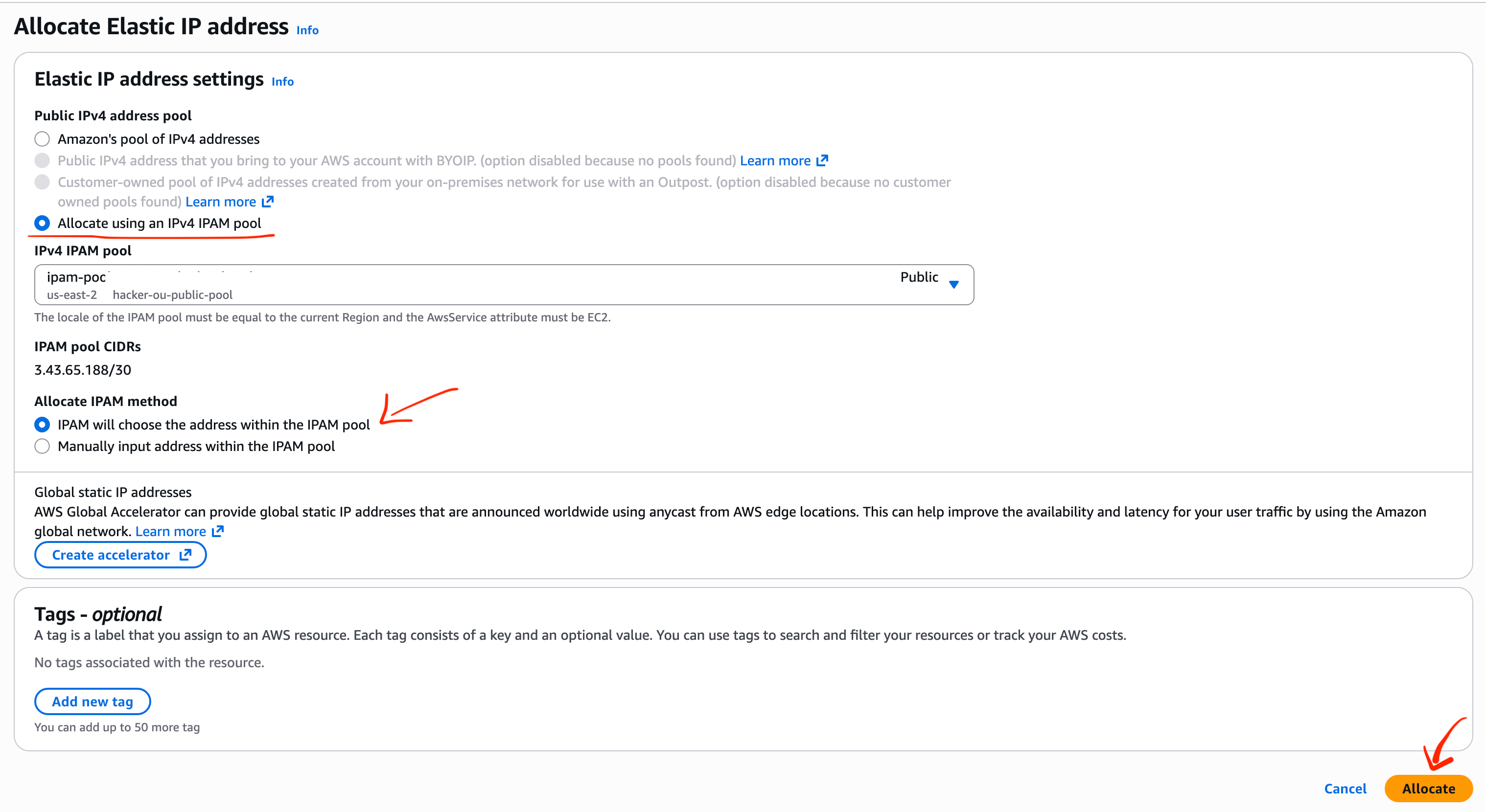 I let AWS pick an IP from the pool but you can manually enter it if you need a specific IP address from the pool. Click Allocate.