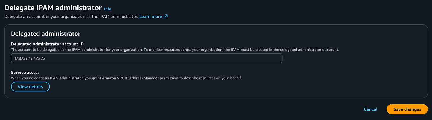 I could create an IPAM here but I want to manage all my networking from my network account. Best practice is not not deploy resources into your AWS Management account. So I’m going to delegate managing this service to my network account.