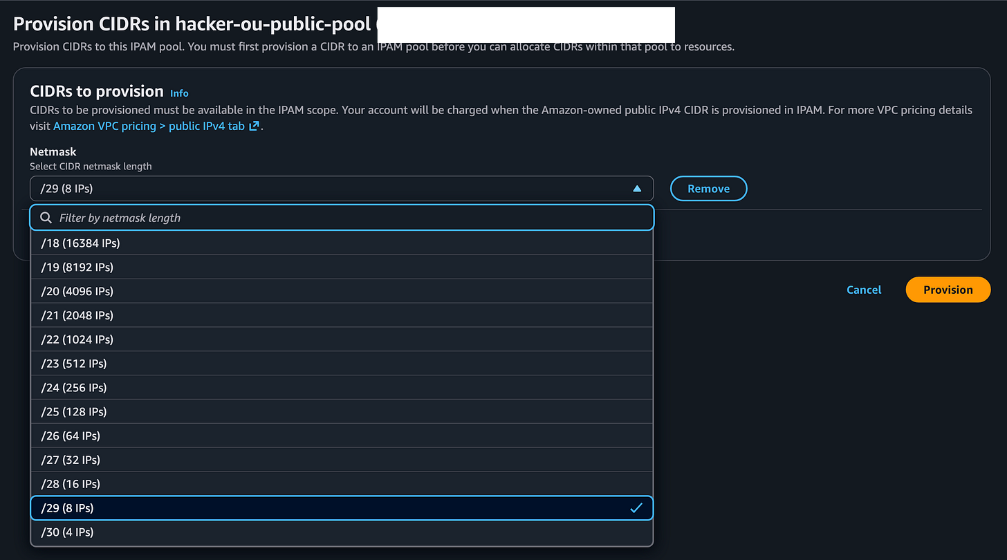 There’s one other nice thing about IPAM vs. EIPs. Your IP addresses are contiguous, meaning they are all IP addresses in the same block and you can add a single rule to your firewall or IP rules in other places instead of having to add four separate rules for four separate IP addresses.