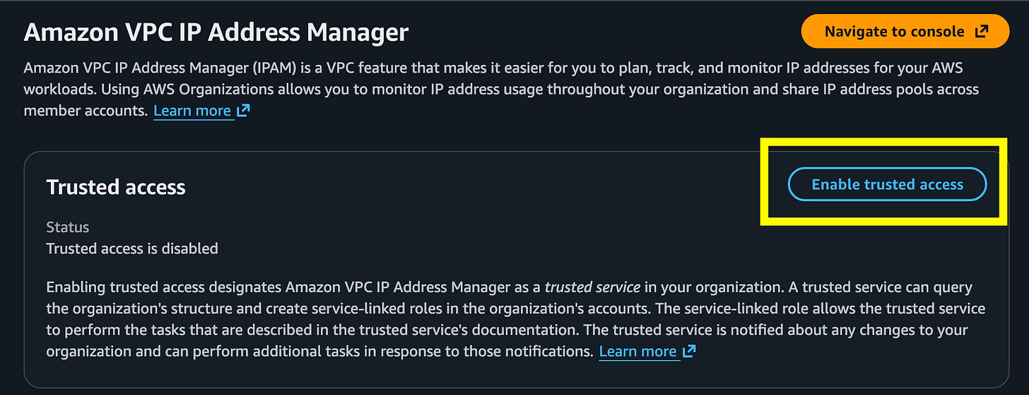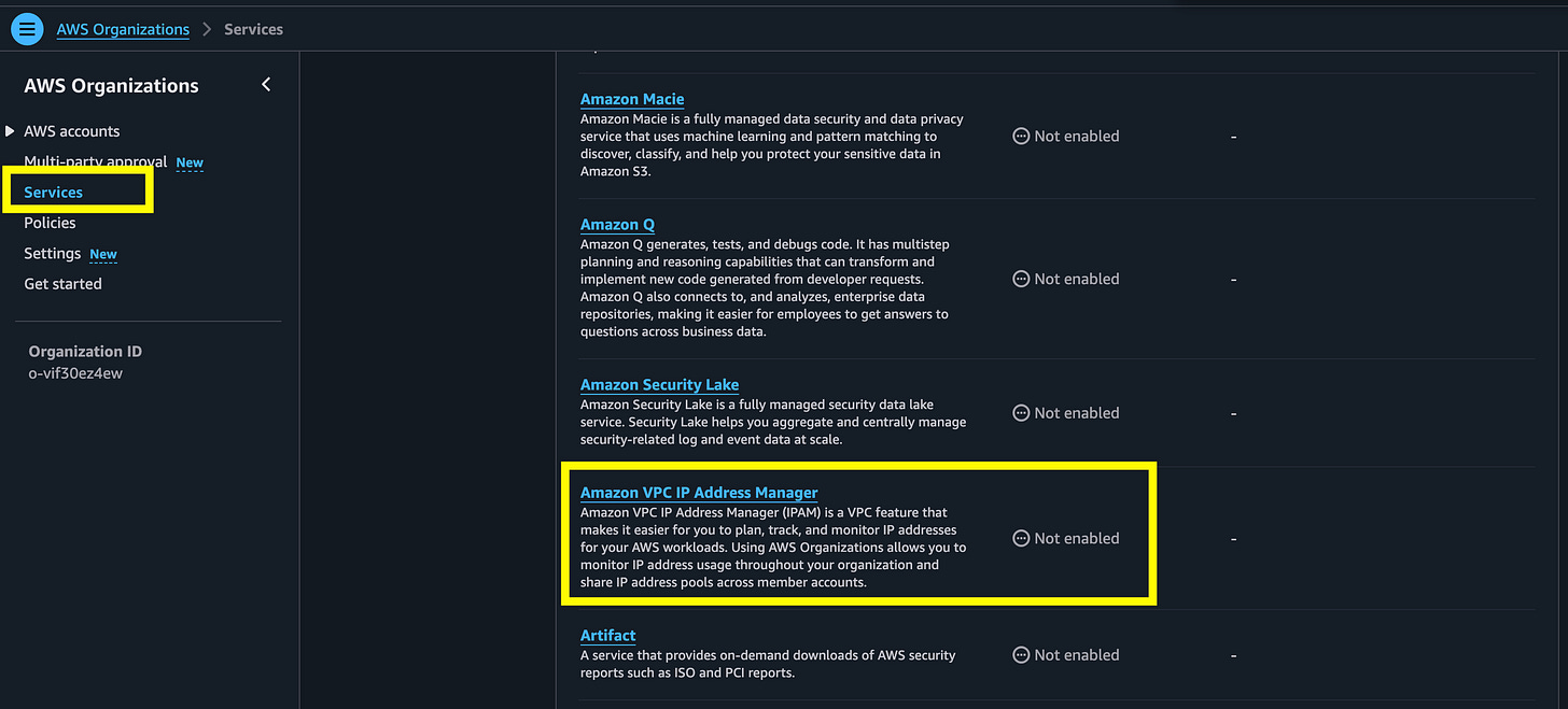 In AWS Organizations choose Services > AWS VPC IP Address Manager
