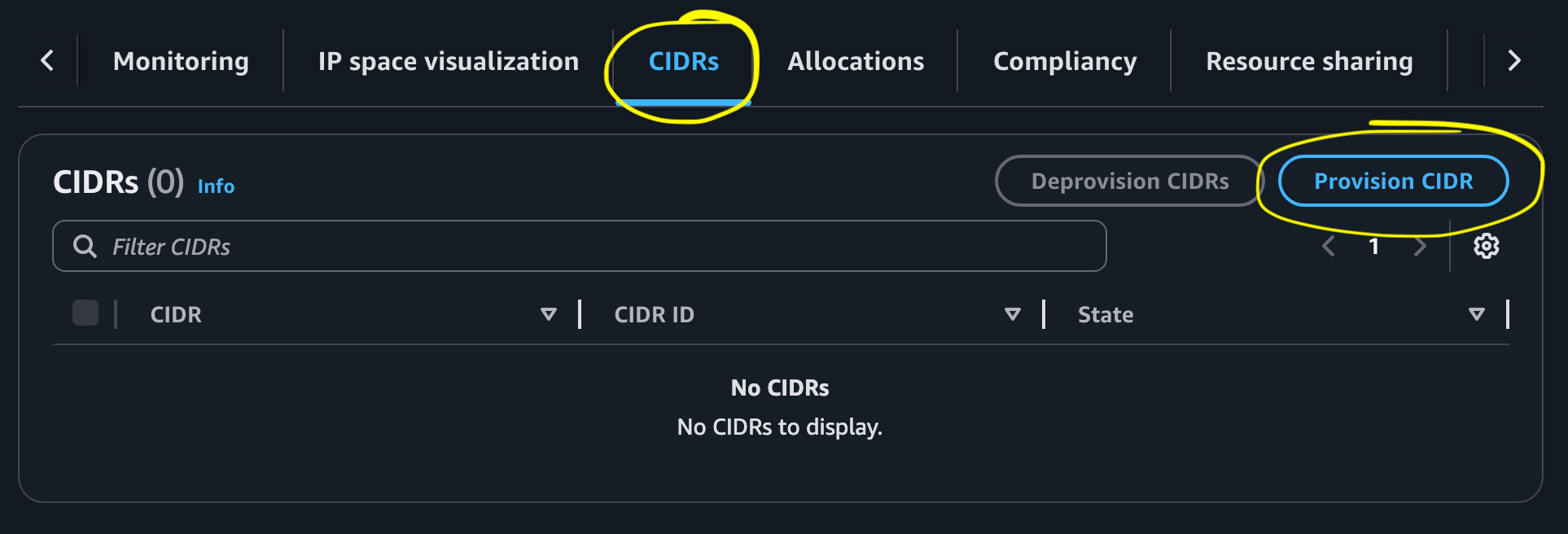 Select CIDRS > Provision CIDR