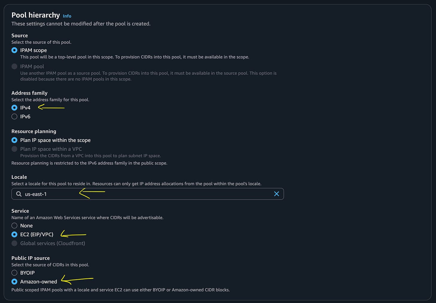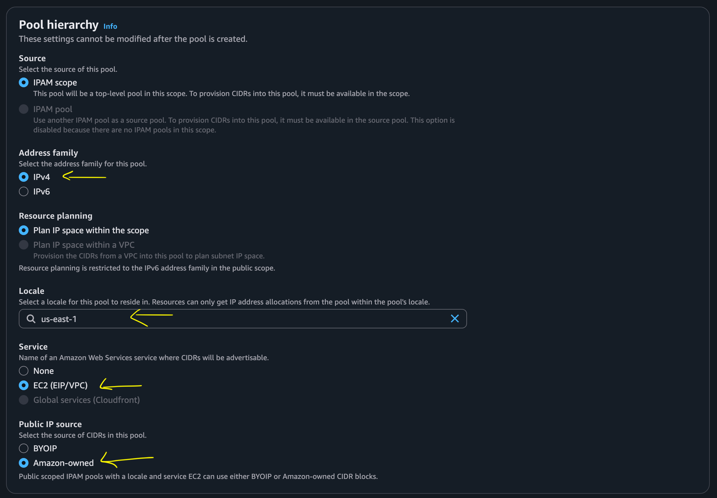 I choose public because I want to connect to IP addresses associated with EC2 instances from remote networks. In other words, I’m going to assign these IP addresses in this pool to EC2 instances and connect to them using SSH or RDP.