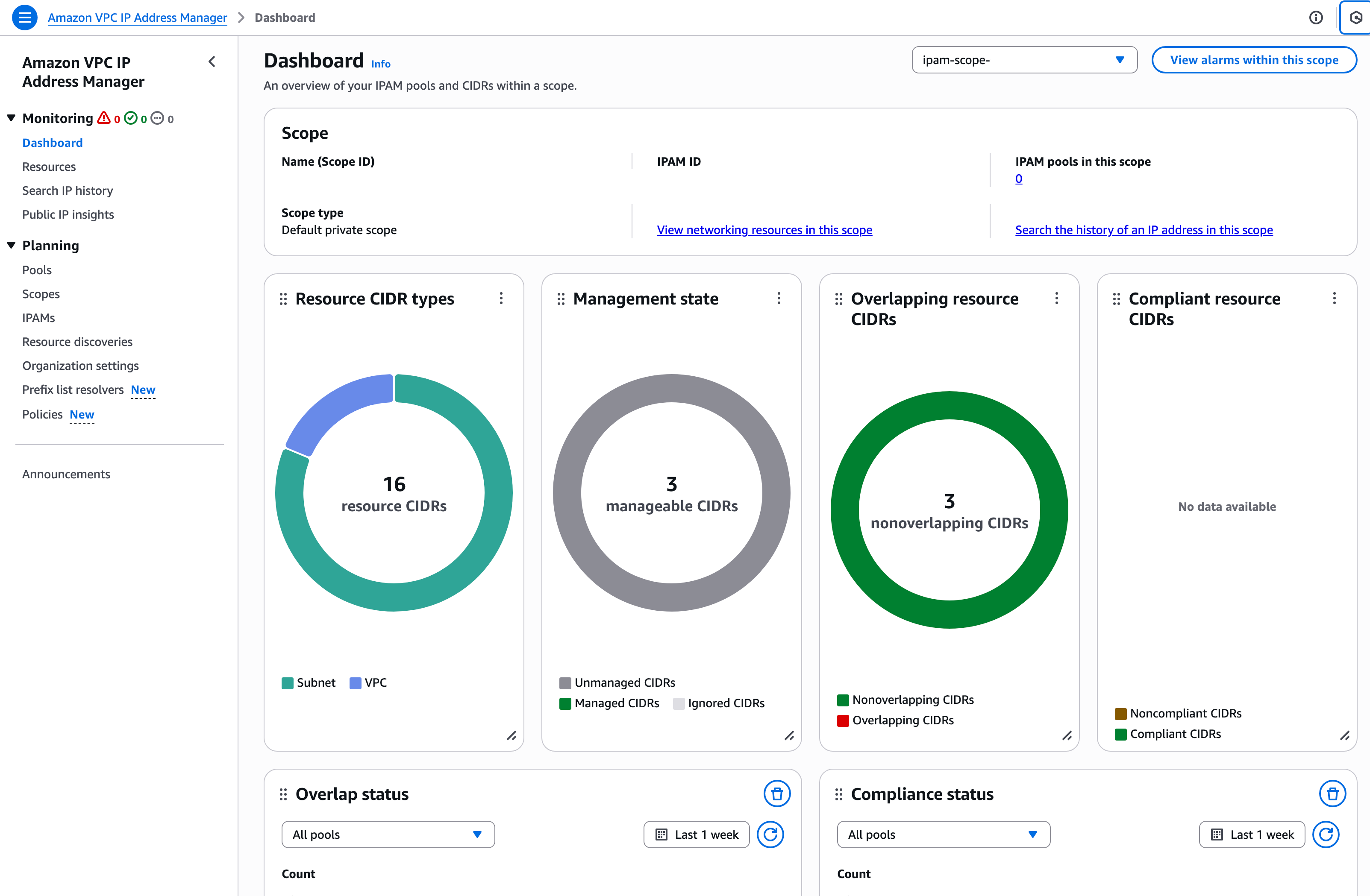 Now when I open up IPAM it looks different. I have a dashboard showing me information about the CIDRs in my VPCs. If you are trying to peer VPCs or create routes between networks it will be important to make sure you don’t have overlapping CIDRs. If you manage networking as I did a while back for Capital One you also may need to manage your IP space and make sure your Subnets and such are sized properly so you don’t run out of IP addresses. Amazon’s IPAM can help with all of that.