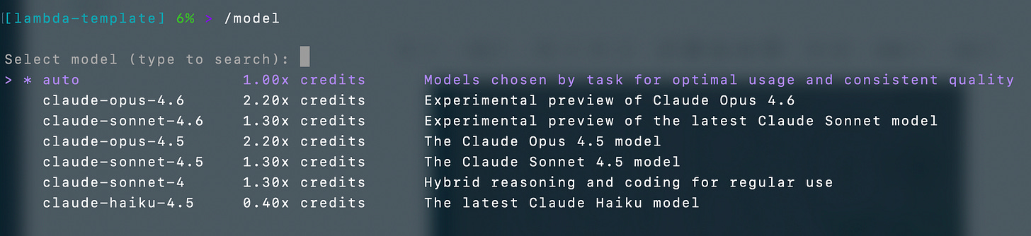 Kiro starts in auto mode that is supposed to select the right model for the prompt you’re using. However, I have consistently found that I will get frustrated going in circles in that mode so I almost immediately switch to another model. As you can see the different models cost different amounts of tokens. Mostly I’ve been using the latest claude-opus-4.6 model.