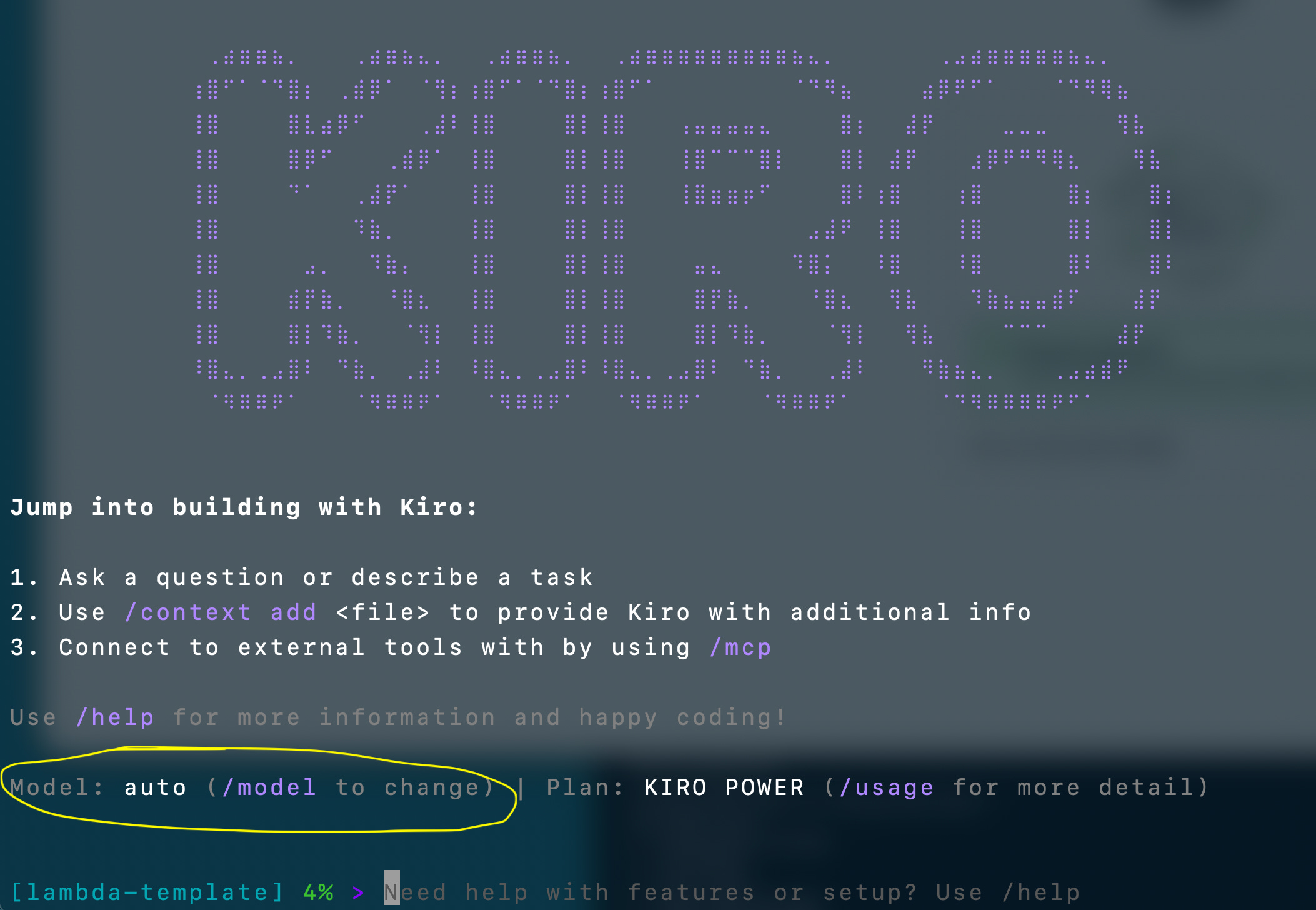 When you start Kiro CLI you can see which model it’s using.